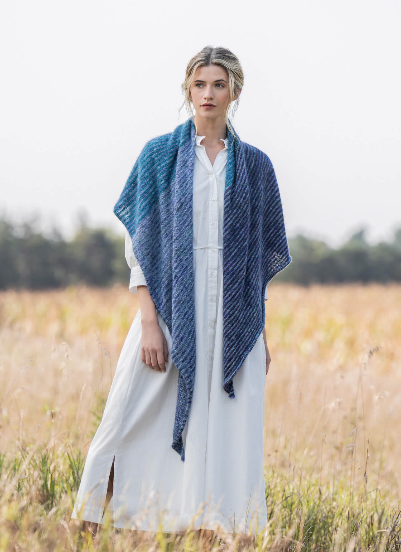 Knit with three colors of Metalico and one color of Hand Dyed Prairie, this colorful wrap has beautiful drape and extra length for many fun styling options.