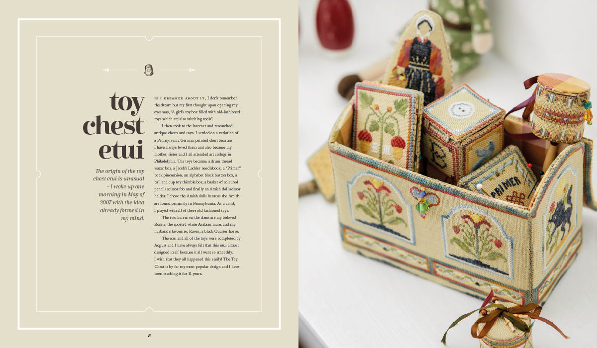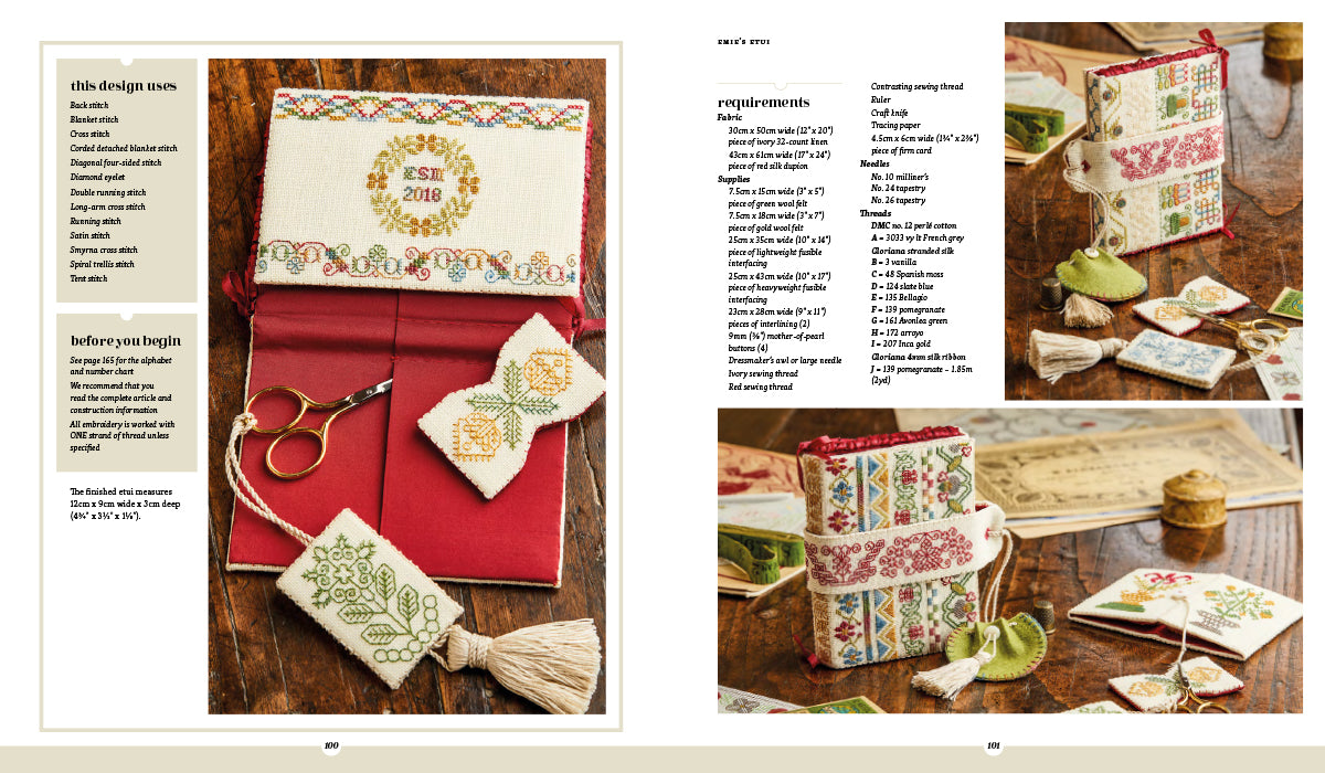 Superb box etui inspired by a 17th century embroidered casket and a range of sampler styles. Accessories include a thimble bag, needlebook, pin cube and scissor fob.
