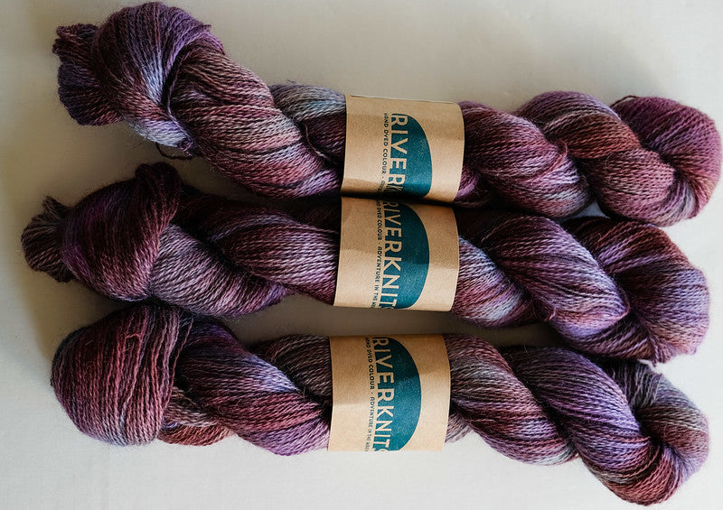 Color: Ink Cap - "Ink Cap is giving hints of foraging at twilight with its soft plums, blues, and browns. This variegated colourway is a lot of fun to work with because every stitch is different", says RiverKnits description.