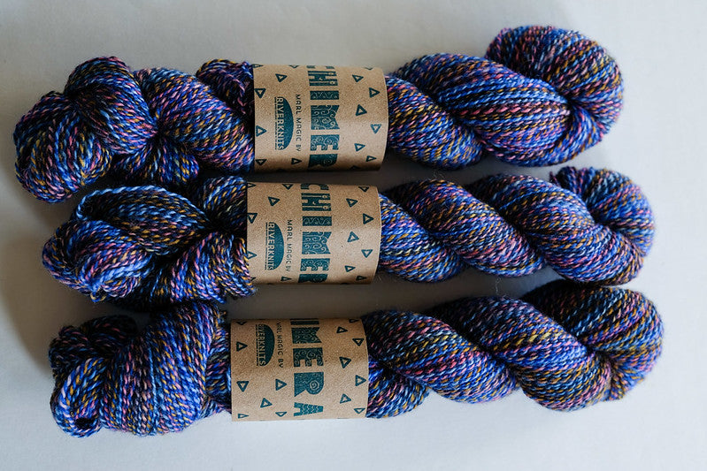 This is CHIMERA yarn from the RiverKnits company. This company does a wonderful job of sourcing British breeds wool and hand-dyeing it in the amazing colors, all in Britain.