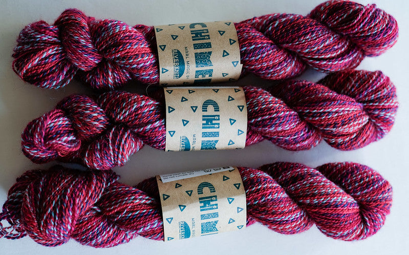 This is CHIMERA yarn from the RiverKnits company. This company does a wonderful job of sourcing British breeds wool and hand-dyeing it in the amazing colors, all in Britain.