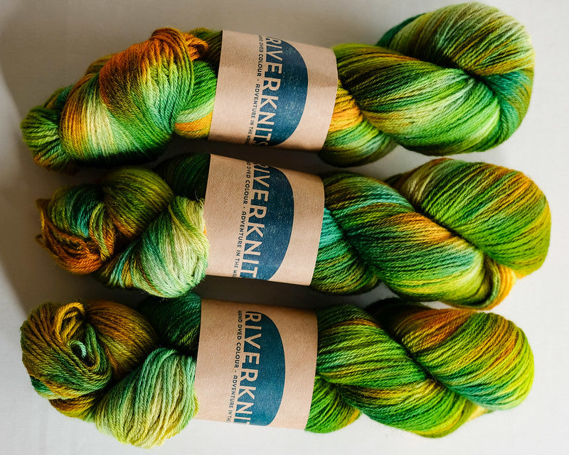 This is one of the five newest colors of NENE 4-ply yarns from RiverKnits company. This company does a wonderful job of sourcing Bluefaced Leicester and hand-dyeing it in the amazing colors, all in Britain.