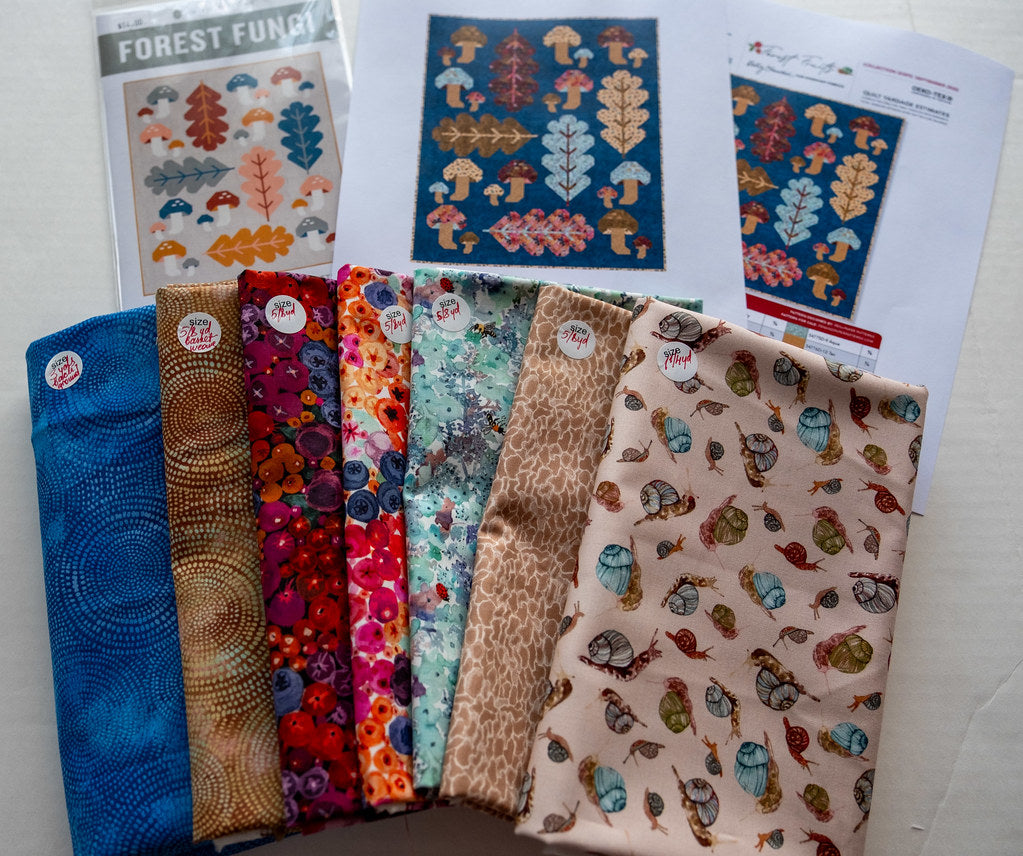 Forest Fungi Quilt Kit will make a 56 3/4"x 69 1/2" quilt. It includes: