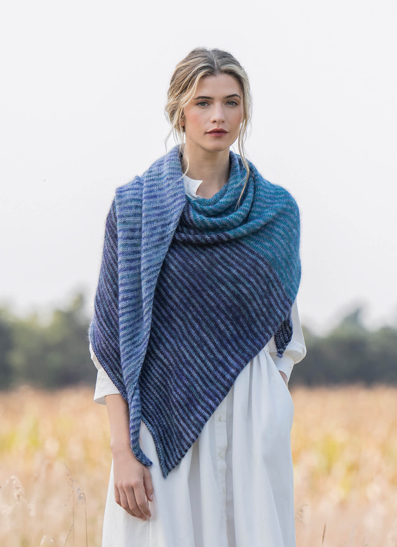 Knit with three colors of Metalico and one color of Hand Dyed Prairie, this colorful wrap has beautiful drape and extra length for many fun styling options.