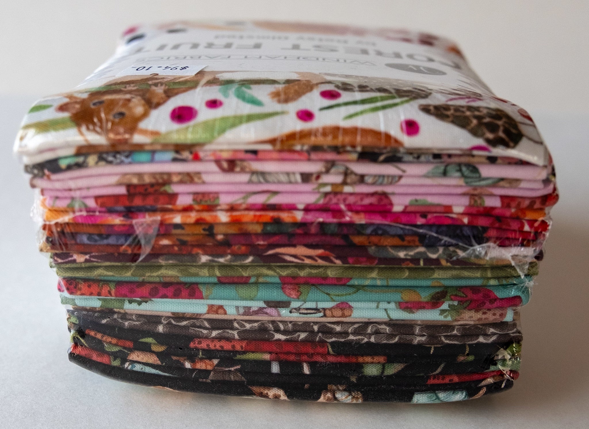 This is a bundle of 18 fat 1/4s of cotton fabrics from FOREST FRUIT collection by Betsy Olmsted. Each fat 1/4 is 18"x22". The collection boasts of bright berry palette colors, wonderfully versatile designs appropriate for both quilt and sewing projects.