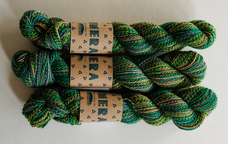 Color: Rainforest, - beautiful combination of two variegated strands of yarn: green/yellow variegations and pink/blue variegations, so the yarn is always changing as you knit, creating unexpectedly amazing outcomes! Try one for a hat project, mittens or socks, or a cowl with Chimera stripes.